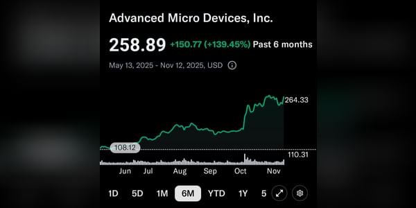 Cena akcie $AMD vyrástla za posledných 6 mesiacov o +139.45% vďaka spolupráci s OpenAI a pozitívnym výhľadom do budúcna.