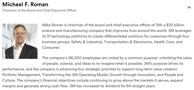 Vedení společnosti má klíčový vliv na její úspěch. Aktuálním CEO 3M je Michael Roman, který má bohaté zkušenosti v oblasti inovací a řízení. Kromě toho má 3M tým výkonných ředitelů s rozmanitými dovednostmi a zkušenostmi v oblasti inovací a obchodu, což je výhodou pro diverzifikovanou firmu jako 3M.