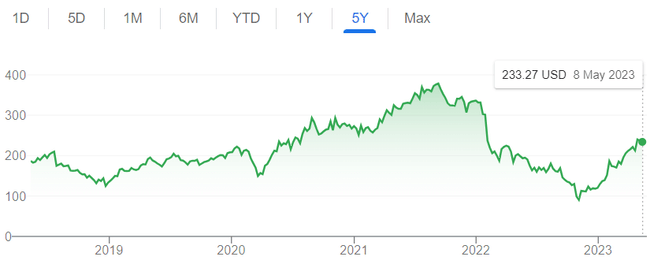 Keďže spoločnosť Meta je jednou z najväčších, ak nie najväčšou spoločnosťou v oblasti sociálnych médií, rozhodli sme sa skontrolovať jej akcie. Ich akcie prišli na trh v máji 2012. Počiatočná cena jednej akcie bola 38,23 USD. Odvtedy bol najvyšší rast akcií 890 %, ktorý dosiahli v septembri 2021, keď bola cena za akciu 378,69 USD. Potom spoločnosť postihlo mnoho negatívnych správ týkajúcich sa ich projektu Metaverse a spôsobili pokles akcií spoločnosti o 78 %, a tak sa cena pohybovala okolo 90 USD, čo je stále oveľa viac ako pôvodná cena. To však nezastavilo spoločnosť v jej ďalšom rozvoji a podarilo sa jej vyšplhať späť, na aktuálnu cenu 237 USD. * Vzhľadom na to, že najvyššia dosiahnutá cena bola približne 380 USD, dáva to akcii skutočne pekný priestor na potenciálny pohyb. [1]