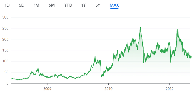 Akcie spoločnosti Volkswagen sú kótované na Frankfurtskej burze cenných papierov. Keď v roku 1994 prišli na trh, cena jednej akcie bola 18,60 EUR. Odvtedy spoločnosť zaznamenala pekný rast a expanziu, čo vytlačilo cenu nahor o 500 %, ak sa pozrieme na súčasnú cenu 119,32 EUR za akciu. * Historické maximum však bolo v roku 2015, keď cena dosiahla 250 EUR a predstavovala rast o viac ako 1200 %. * Odvtedy mali akcie pomerne volatilný priebeh, keďže po raste nasledovala korekcia, ale v roku 2021 opäť dosiahli ďalší vrchol na úrovni 245 EUR. * Odvtedy cena klesá, ale to dáva akcii veľmi pekný potenciálny priestor na pohyb. [5]