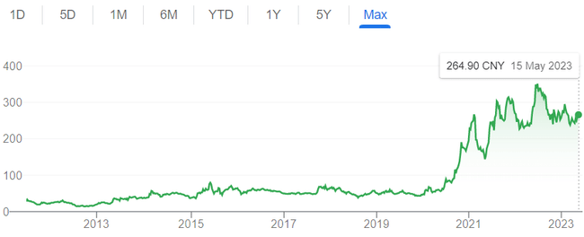 Od svojho vstupu na burzu v roku 2011 pri cene 28 CNY zažili ich akcie neuveriteľnú jazdu. Za posledných 12 rokov sa im podarilo narásť o viac ako 846 % a dosiahnuť cenu 265 CNY, na ktorej sú dnes. * Najprudší rast bol v polovici roka 2020, keď akcie rýchlo poskočili o 360 %, a potom nasledovala korekcia. * Historické maximum dosiahla v roku 2022, keď jej cena dosiahla 351 CNY. * [2]