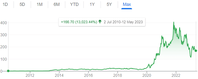 Keď $TSLA vstúpila na burzu Nasdaq, jej cena bola len 1,28 USD. Súčasná cena akcií je 168 USD, čo znamená, že za 13 rokov sa spoločnosti podarilo zabezpečiť rast o neuveriteľných 13 000 %. * To však nie je najvyššia hodnota, na ktorej sa akcie nachádzali. Akcie dosiahli historické maximum v roku 2021, keď cena akcie dosiahla 406 USD, čo znamená, že v tom čase bol rast raketový 31,725 %. * Len pre predstavu, ak by ste v roku 2010 investovali 1,28 USD, v roku 2021 by ste mali 406 USD, ak nerátame žiadne náklady a poplatky. * [7]