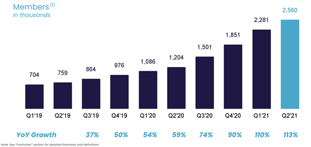 Nejdůležitější je, že aktivita na platformě SoFi $SOFI se zrychluje ve všech oblastech. Společnost SoFi vykázala již osmé čtvrtletí po sobě zrychlující meziroční růst celkového počtu svých členů, který za čtvrtletí dosáhl 2,56 milionu, což představuje nárůst z 1,2 milionu ve 2. čtvrtletí 2020 (což představuje nárůst o 113 %) a 12 % sekvenční nárůst oproti 1. čtvrtletí.