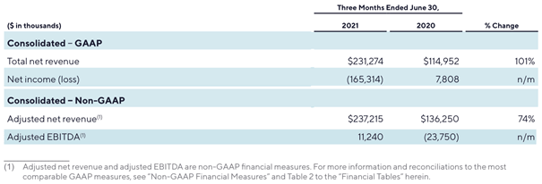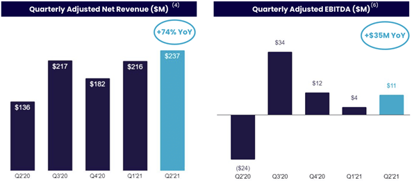 Očištěné tržby za čtvrtletí vzrostly meziročně o 74 %, což je mnohem více, než vedení původně předpokládalo: 58 až 61% růst, a výrazně nad očekáváním analytiků. Společnost navíc zaznamenala další čtvrtletí s kladným provozním ziskem EBITDA, který za čtvrtletí dosáhl 11 milionů dolarů, což je meziročně o 35 milionů dolarů více než záporných 24 milionu dolarů ve 2. čtvrtletí 2020.