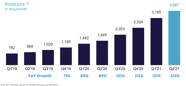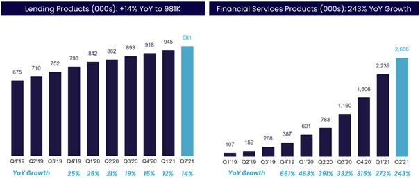 V tomto čtvrtletí také pokračovalo zrychlování meziročního růstu u produktů, které se zvýšily o 123 % a dosáhly 3,7 milionu. V meziročním srovnání SoFi přidala více než +2 miliony produktů, což představuje 123% meziroční růst.