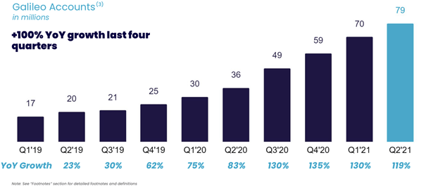 Galileo, jejich platforma pro finanční technologie, dosáhla 79 milionů účtů, což představuje nárůst o 119 % v tomto čtvrtletí, kdy společnost přidala 42,9 milionu nových účtů. Za poslední čtyři čtvrtletí tak Galileo vykázalo více než 100% meziroční růst. Platforma je klíčovým základním kamenem budoucího růstu SoFi a skutečnost, že roste trojciferným tempem a v červenci poprvé překonala 100 miliard dolarů ročního objemu plateb, ukazuje, že firma má nejen již značný rozsah, ale také skutečnou konkurenční výhodu, což se odráží v meziročním růstu.