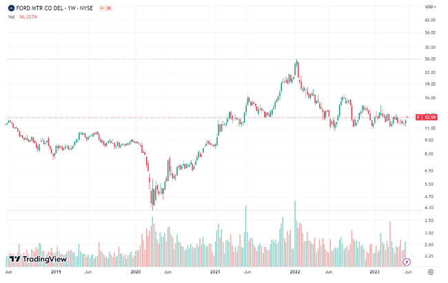 Výkonnost akcií společnosti FORD MTR CO za posledních 5 let. (Zdroj: tradingview.com)