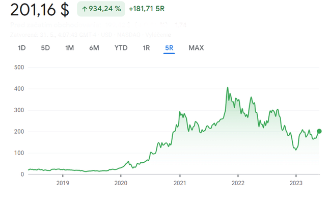 Výkonnost akcií společnosti $TSLA za posledních pět let. (Zdroj: Google)*