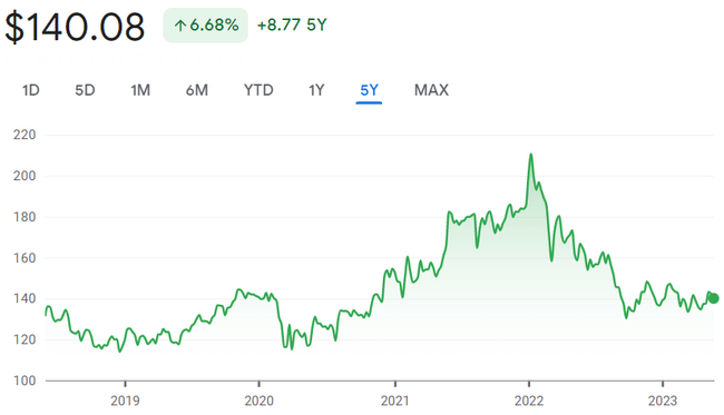 Pohyb akcií spoločnosti Toyota za posledných päť rokov. (Zdroj: Google Finance) *