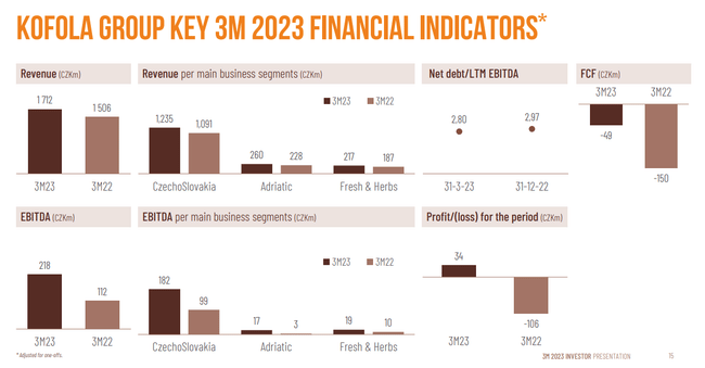 K dobrému výsledku prvním čtvrtletí přispěly jak stabilizovaná cena energií, tak zvyšující se obliba čerstvých šťáv a zdravých pokrmů UGO a bylinných čajů LEROS. Trend poklesu spotřeby (zvláště vod a sirupů) však stále pokračuje. Meziročně se prodalo přibližně o 10% méně litrů Kofoly.