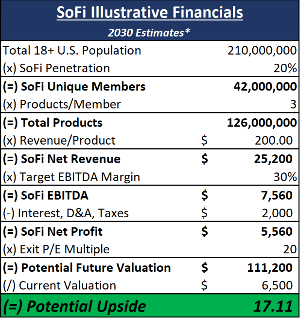 Populácia 18 a viac rokov v USA v súčasnosti meria približne 210 miliónov ľudí. Pri pravdepodobnosti, že približne 20 % týchto ľudí by mohlo byť do roku 2030 členmi SoFi. To by znamenalo členskú základňu SoFi približne 42 miliónov ľudí. Myslíme si, že väčšina používateľov bude využívať približne tri produkty (Peniaze, Kreditná karta a Invest), čo znamená, že celkovo sa použije 126 miliónov produktov. Odhadujeme, že priemerný príjem na produkt bude v tom čase približne 200 USD. Za predpokladu, že to bude znamenať, že príjmy v roku 2030 budú niečo viac ako 25 miliárd dolárov.