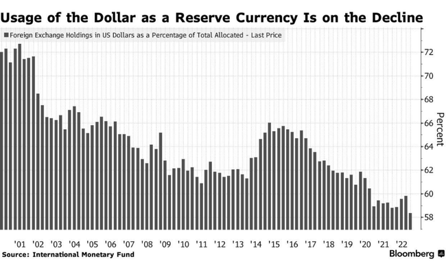 Dedolarizace devizových rezerv centrálních bank probíhá v plném proudu. Názorně to ukazuje následující graf Bloombergu na základě dat Mezinárodního měnového fondu. Zatímco ještě na přelomu milénia činil podíl dolaru na devizových rezervách přibližně 72 %, nyní jsme na novodobém minimum 58 %, což představuje výrazný pokles o 14 procentních bodů. V celkovém úhrnu byly přibližně od roku 2014 centrální banky čistými prodávajícími amerických vládních dluhopisů (US Treasuries) a místo toho přesměrovaly svou pozornost na nákup fyzického zlata. Vzhledem k rekordnímu aktuálnímu rozpočtovému deficitu americké vlády, který by měl v průběhu druhého pololetí letošního roku přesáhnout dva biliony dolarů!, a výrazné neochotě cizích centrálních bank tento deficit financovat prostřednictvím nových nákupu nových amerických vládních dluhopisů se nedá úplně vyloučit, že v následujících měsících bude muset do hry opět vstoupit americký Fed tím, že obnoví program kvantitativního uvolňování, resp. zastaví aktuálně probíhající program kvantitativního utahování, tedy program průběžných prodejů amerických vládních dluhopisů z jeho bilance.