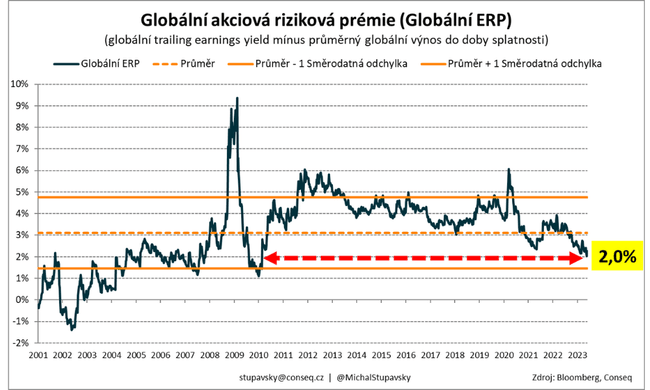 Globální akciové trhy jsou v tuto chvíli nejméně atraktivní na relativní bázi vůči dluhopisům od roku 2010, neboť globální akciová riziková prémie (Global Equity Risk Premium – Global ERP) nyní činí pouze 2,0 %.