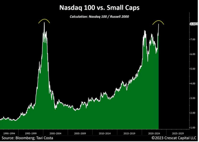Že se na trhu amerických technologických společností velice pravděpodobně schyluje k bublině dokládá také následující graf, který udává poměr amerického indexu technologických akcií NASDAQ 100 a amerického indexu akcií s malou tržní kapitalizací Russell 2000. Aktuální poměr těchto indexů je totiž nyní na úrovni vrcholu technologické bubliny z roku 2000. Také aktuální valuační ukazatele indexu NASDAQ 100 jsou skutečně velice výmluvné: P/E 32x, EV/EBITDA 18x a EV/Sales 4,7x.