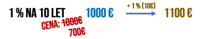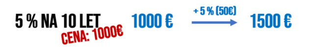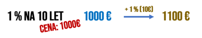 Ovšem v dnešní době máme úplně jiné úrokové sazby. A pokud se na dnešním trhu běžně prodávají dluhopisy s 5% úrokovou sazbou a se stejnou dobou splácení, tedy 10 let, pak investor, který zainvestuje 1.000 €, nemá jen 10 €, ale rovnou 50 € za rok. Ve finále tedy získá 500 €.