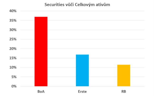 Např. Podíl dluhopisů nebo podobných investičních instrumentů je u BoA nejvyšší, přes 35 %. Oproti tomu Erste má lehce přes 15 % investičních instrumentů, které tímto trpí vůči celkovým aktivům. RB má pouze něco přes 10 %. Efekt růstu úrokových sazeb má na banky v Evropě mnohem menší vliv než v Americe.
