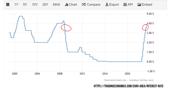 Úrokové sazby Evropské centrální banky (ECB) jsou již na 3,75 %, což je nejvíce od roku 2009. Kolabují banky a hrozí bankroty některých států EU.