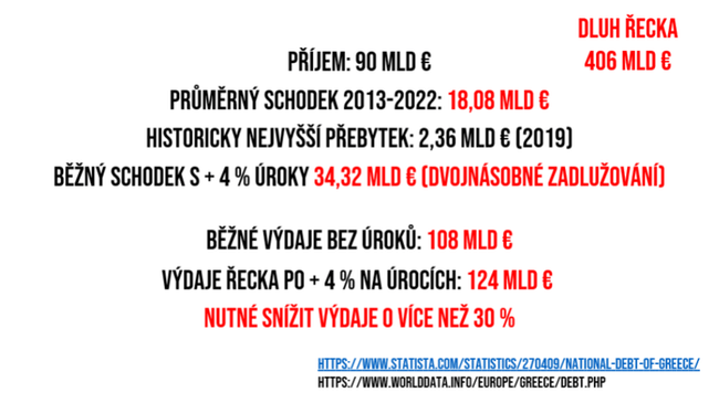 Jak můžeme vidět, v Řecku mají opravdu velký problém, a to v našich předchozích výpočtech nejsou zahrnuty zmiňované zvyšující se úrokové sazby. Při dnešní úrokové sazbě 3,75 % a dluhu Řecka ve výši 408 mld. € by stát musel ročně zaplatit dalších 16 mld. € navíc na zvýšených úrocích. Celková ztráta Řecka by tak spolu s původním osmnáctimiliardovým schodkem činila 34 mld. € ročně. Vyšší splátky by zvedly roční náklady ze 108 mld. € na 124 mld. € Pokud by se tedy Řecko chtělo dostat na vyrovnaný rozpočet, i když to dodnes nedokázali, museli by snížit své výdaje 28 %. Pro státní rozpočet, který je obecně hodně napjatý, je takové snížení výdajů naprosto nemyslitelné a nereálné. Řecko tedy buď zkrachuje nebo se úrokové sazby budou muset velmi rychle snížit.