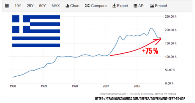 Řecká vláda má v dnešní době dluh ve výši 408 mld. €. Ročně od svých poplatníků vyberou zhruba 90 mld. €, avšak jejich roční výdaje činí 108 mld. €. Každý rok jsou tedy ve ztrátě 18 mld. €. Schodek 18 mld. € je průměr za posledních 10 let, některé roky byly ještě mnohem horší. Největší přebytek, kterého kdy dosáhli, činil pouze 2,4 mld. € v roce 2009.