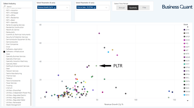 Podle osy Y se společnost Palantir $PLTR jistě obchoduje s vyšším násobkem PS ve srovnání se svými kolegy. Z osy X je však také patrné, že společnost Palantir roste rychleji než většina ostatních akcií v její skupině vrstevníků. Existuje několik společností, které rostou rychleji než Palantir, ale obchodují se za ještě vyšší násobky. Investoři tedy v podstatě platí prémii za vlastnictví rychle rostoucí kvalitní akcie, kterou je společnost Palantir.