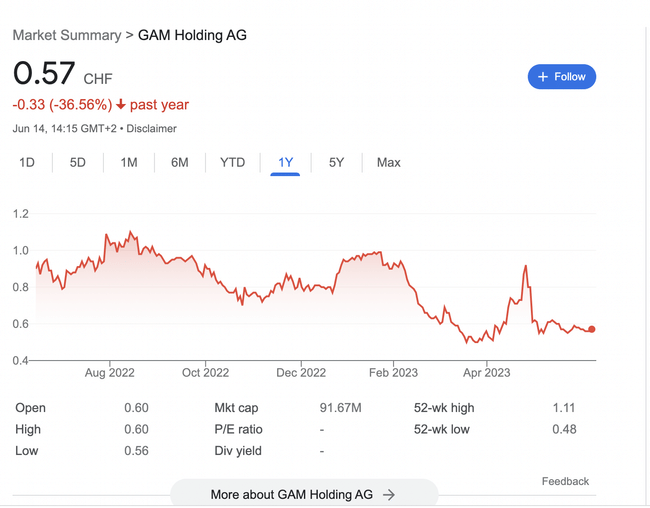 Za posledne roky sa týmto laksnym pristupov GAM dostal az na uroven pod 1 CHF. Aktualne je spolocnost ohodnotena na menej ako 100m CHF.