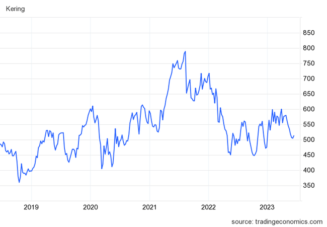 Graf 3 Vývoj akcii spoločnosti Kering v priebehu piatich rokov