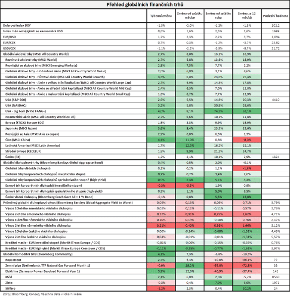 Pokud jde o vývoj na finančních trzích v minulém týdnu, vývoj byl poměrně hodně pozitivní. Akciové trhy dle nejširšího globálního akciového indexu MSCI All Country World připsaly zisk 2,7 % a dluhopisové trhy dle nejširšího globálního dluhopisového indexu Bloomberg Barclays Global Aggregate Bond připsaly zisk 0,4 %.