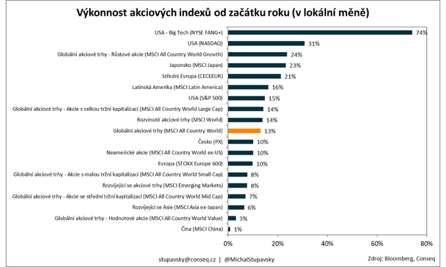 Americkým akciím se zatím v letošním roce daří na výbornou. Hlavní index S&P 500 zatím připisuje zisk 15 %, což je přibližně v souladu s nejširším globálním akciovým index MSCI All Country World, který připisuje zisk 13 %. V rámci amerického akciového trhu se přitom daří především technologickým titulům. Široký index technologických akcií NASDAQ zatím připisuje vysoce nadprůměrný zisk 31 % a index deseti největších amerických technologických akcií NYSE FANG+ připisuje stěží uvěřitelný zisk 74 %!