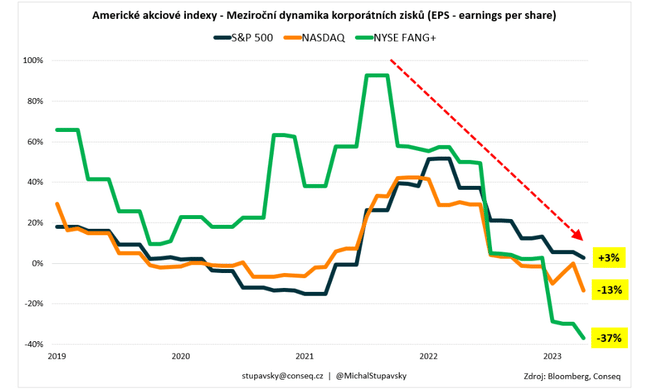 Následující graf znázorňuje meziroční dynamiku korporátních zisků výše zmíněných amerických akciových indexů. Na grafu je přitom jasně vidět, že přibližně od přelomu let 2021 a 2022 dynamika korporátních zisků těchto společností velice prudce klesá. Aktuální meziroční dynamiku korporátních zisků v rámci indexu S&P 500 činí již pouze +3 % s tím, že trend křivky na grafu jasně indikuje, že recese amerických korporátních zisků se ještě v průběhu tohoto roku rozhodně vyloučit nedá. A v případě technologických indexů je situace ještě daleko tristnější. Dynamika korporátních zisků v rámci indexu NASDAQ totiž nyní klesá meziročním tempem -13 % a v případě indexu největších technologických titulů NYSE FANG+ tempem dokonce -37 %! Troufáme si proto tvrdit, že doslova extrémní valuační násobky v rámci indexů NASDAQ a NYSE FANG+ velice pravděpodobně nejsou ospravedlnitelné fundamentálními faktory, rozhodně ne racionálním a smysluplným očekáváním ohledně růstu korporátních zisků na horizontu příštích 12 až 24 měsíců. Navíc u technologických akcií platí, že jsou to tzv. aktiva s dlouhou durací (long-duration assets), kdy relativně nadprůměrná část toku tržeb, zisků, cash flow a dividend je situována více v budoucnosti. A protože úrokové sazby, resp. diskontní sazby v posledních dvou letech zásadním způsobem vzrostly, i tento fundamentální valuační faktor hovoří ve prospěch nižších a nikoliv vyšších valuačních násobků ve srovnání s pandemickým obdobím.