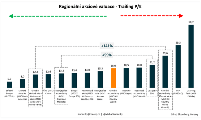 Valuace P/E indexů NASDAQ a NYSE FANG+ jsou totiž evidentně extrémně nadhodnocené. Index NASDAQ se totiž nyní obchoduje za 39-násobek ročních zisků a index NYSE FANG+ dokonce za 58-násobek ročních zisků! Přitom obvykle platí, že vysoké valuační násobky odráží tržní očekávání velice silného budoucího růstu korporátních zisků.