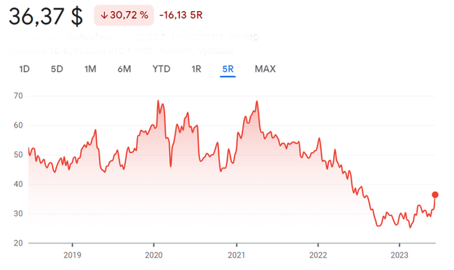 Výkonnost akcií společnosti Intel za posledních pět let. (Zdroj: Google)*