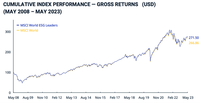 Vývoj hodnoty indexu MSCI World ESG Leaders ve srovnání s tradičním indexem MSCI World od května 2008 do května 2023 ( Zdroj: msci.com)*