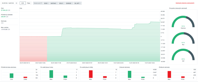 Výchozí stav 49 000,-Kč, většina obchodů na DE30 short/long.