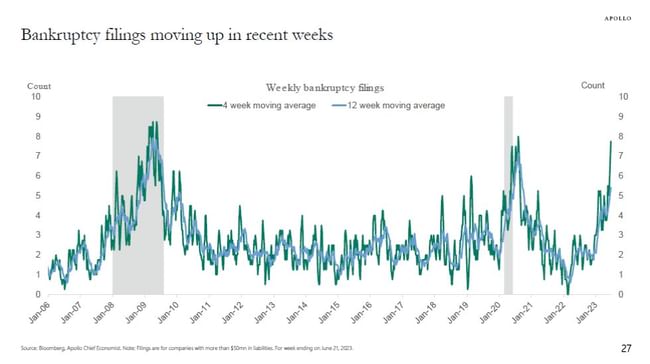 Graf z dílny Torstena Sløka, hlavního ekonoma private equity společnosti Apollo Global Management, ukazuje počet bankrotů amerických společností, které mají závazky přes 50 milionů dolarů. Zatímco na začátku loňského roku byly bankroty větších amerických společností výjimkou, aktuálně jejich počet dosahuje vysokých úrovní z pandemického roku 2020 a z období globální finanční krize v roce 2009.