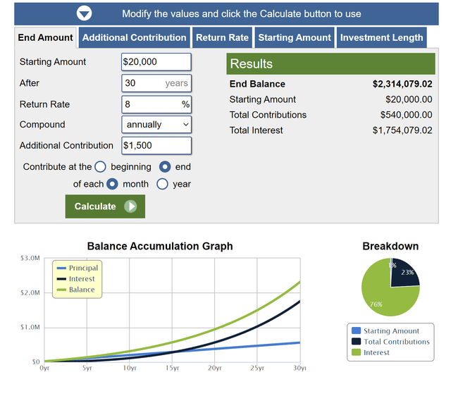 Berme průměrného českého občana, který by chtěl investovat, ale jeho kapitál není nic velkého a chce si odkládat do svých investic 1000-2000 měsíčně. Posílá to do ETF na SNP a nic neřeší, předpokládejme, že se indexu podaří poměrně pěkné zhodnocení a za rok bude mít návratnost 8 %. Jeho vstupní vklad byl 20 000. (Vše v CZK, kalkulačka ukazuje $, to neřešme)