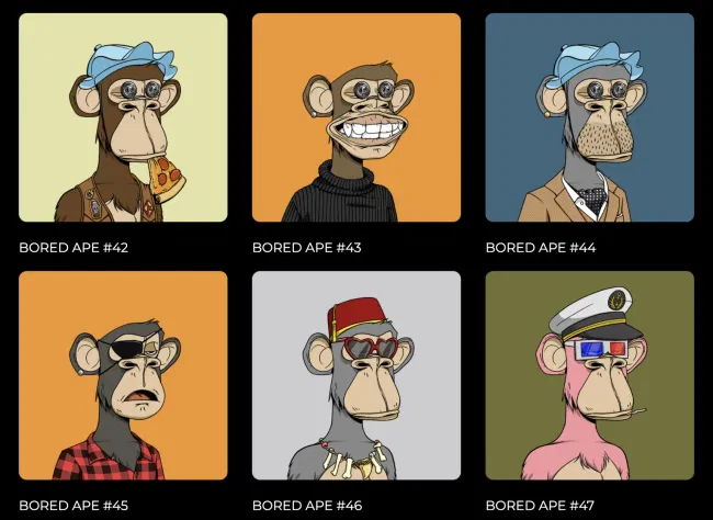 Největší zájem je momentálně o opice. Bored Ape Yacht Club, který byl spuštěn v dubnu, zahrnuje 10 000 opic s punkovou atmosférou, oblečených do truckerských klobouků, náušnic na cvočky a rošťáckých úsměvů. Při uvedení na trh se opice prodávaly za ekvivalent 186 dolarů za kus. Nyní stojí nejlevnější opice více než 80 000 dolarů a několik se jich prodalo za více než 300 000 dolarů za kus podle dnešního kurzu.