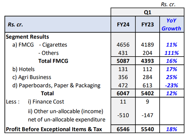 Základní cigaretový byznys vykázal téměř 13% meziroční nárůst tržeb. To nám naznačuje, že cigarety v Indii, narozdíl  třeba od Evropy jsou na vzestupu. Necigaretový FMCG (fast moving consumer goods) byznys zaznamenal meziroční nárůst tržeb o 16 %. Divize papíren a obalů vykázala meziroční pokles tržeb o 6,5 %. Provozní zisk cigaretového byznysu vzrostl o 11 % YoY a provozní zisk necigaretového FMCG byznysu se více než zdvojnásobil.