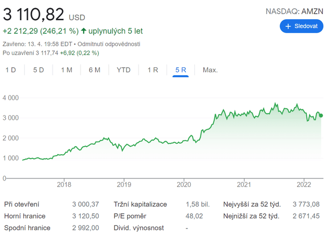 Split je skoro vždycky dobrá sázka. Akcie poskočí hned po zveřejnění a pak znovu hned po splitu. Neberu to ale jako signál k nákupu. Stačí, že je společnost silná dlouhodobě. COž Amazon rozhodně je