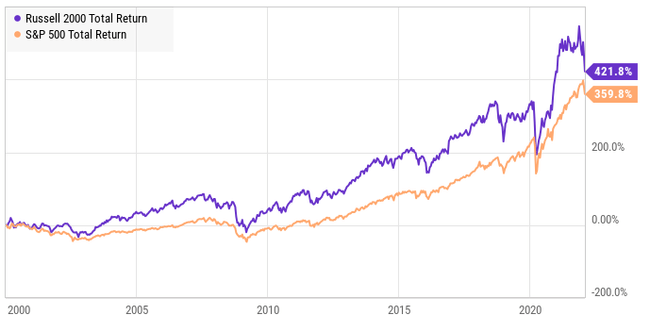 Malé společnosti často jsou mladé firmy. Mívají značný růstový potenciál, ale obecně jsou méně stabilní než jejich větší, zavedení kolegové, a často nejsou ziskové. Nicméně srovnání od roku 2000 mezi indexem zaměřeným na small-cap akcie Russell 2000 a indexem zaměřeným na velké firmy S&P 500 ukazuje, že small-cap akcie předčily výkonnost velkých společností. O tom vypovídá následující graf: