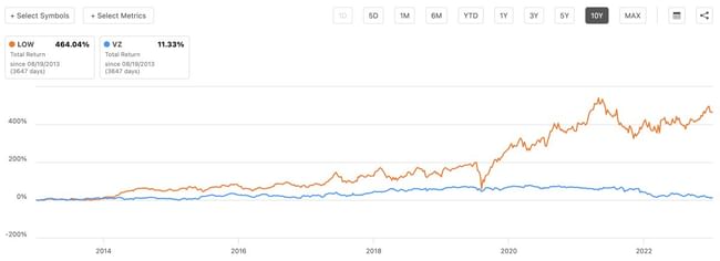 To znamená, že pokud jste v roce 2013 investovali 1 000$ do každé z těchto společností, $VZ by vám nyní vyplácel 54,70$ ročně, zatímco $LOW by vám vyplácel 100,10$. Nemluvě o tom, že celková návratnost $LOW během této doby byla 464,04 %, zatímco $VZ měl celkovou návratnost pouze 11,33 %!