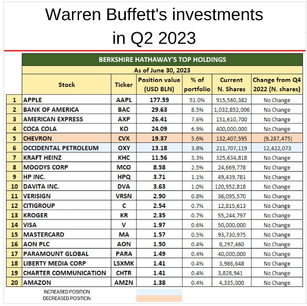Warren Buffett za druhý Q v tomto roce neudělal ve svém portfoliu moc obchodů, ale přece jenom u pár akcií navyšoval, nebo snižoval pozici. Buffett především navyšoval pozici na akciích $OXY a snižoval pozici na akciích $CVX. Na seznamu níže je 20 akcií ve kterých má Buffett nejvíce peněz.