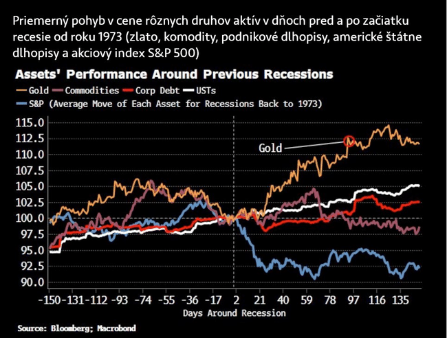 V tuto chvili nikdo nevi, jak skonci zvysovani urokovych sazeb centralnimi bankami. Ve hre jsou 3 scenare: recese, stagflace a softlanding. Nasledujici graf ukazuje, jak by se mohla vyvijet cena ruznych aktiv v pripade recese v casovem intervalu nekolika mesicu.