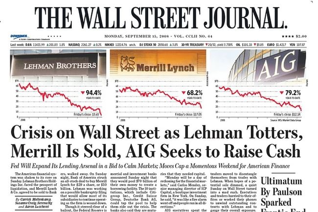 Dne 15. září 2008, se zhroutila nejen čtvrtá největší – za Goldman Sachs, Morgan Stanley a Merrill Lynch – americká banka Lehman Brothers, ale i víra a nepsaná doktrína, že některé firmy „jsou příliš velké na to, aby padly" (v angličtině „to big to fail"). Jinak řečeno, že největším firmám a zároveň zaměstnavatelům majícím zásadní vliv na ekonomiku vždycky v potížích někdo – zejména stát – pomůže.