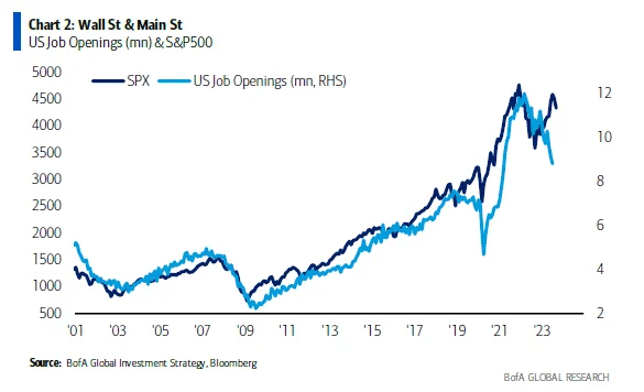 Proc je dulezita nezamestnanost v USA a jaky vliv ma na cenu americkych akcii? Pekne to ukazuje nasledujici graf, ktery porovnava S&P 500 a otevrene pracovni pozice: