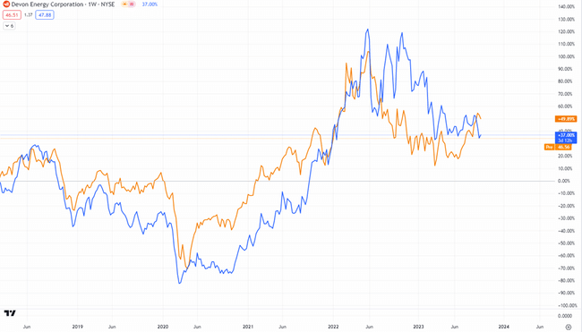 Cena akcií $DVN od covidového low významně stoupla (o více než 900 %). To je opravdu významný růst. Pokud se na graf podíváme pozorněji, můžeme si všimnout jisté korelace cen $DVN a ropy. Není to úplně 1:1, ale podobnost zde je. Na grafu níže se můžete podívat na porovnání.