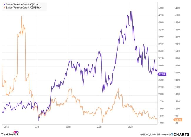 Moynihan také uvedl, že kvalita úvěrů jeho banky od komerčních zákazníků je velmi silná, což naznačuje pozitivní výhled. V neposlední řadě je akcie Bank of America nyní dobře oceněna, obchoduje se za poměrem cena-k-zisku pouze 7,9. Jak ukazuje graf, tato cena je nižší než kdykoli v poslední dekádě, s výjimkou krátkého poklesu na začátku pandemie.