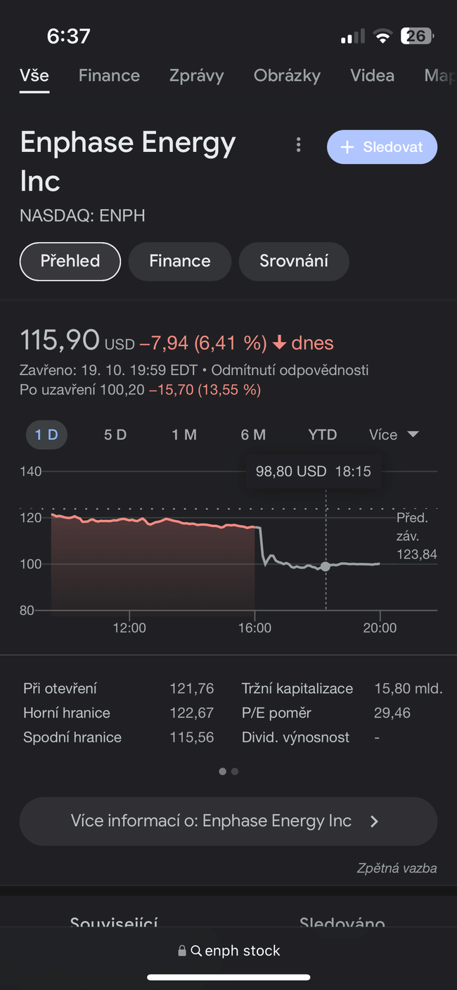 Enphase mám, zajímavé bylo, že nejdřív to rostlo. Já vstupoval na 120$, před pár dny to vyrostlo na 130$ a teď výplach. Nečekal jsem, že ty zprávy budou špatné, protože se předpokládalo, že se jim povede dobře. Navíc když jsou jedni z nejlepších na trhu.