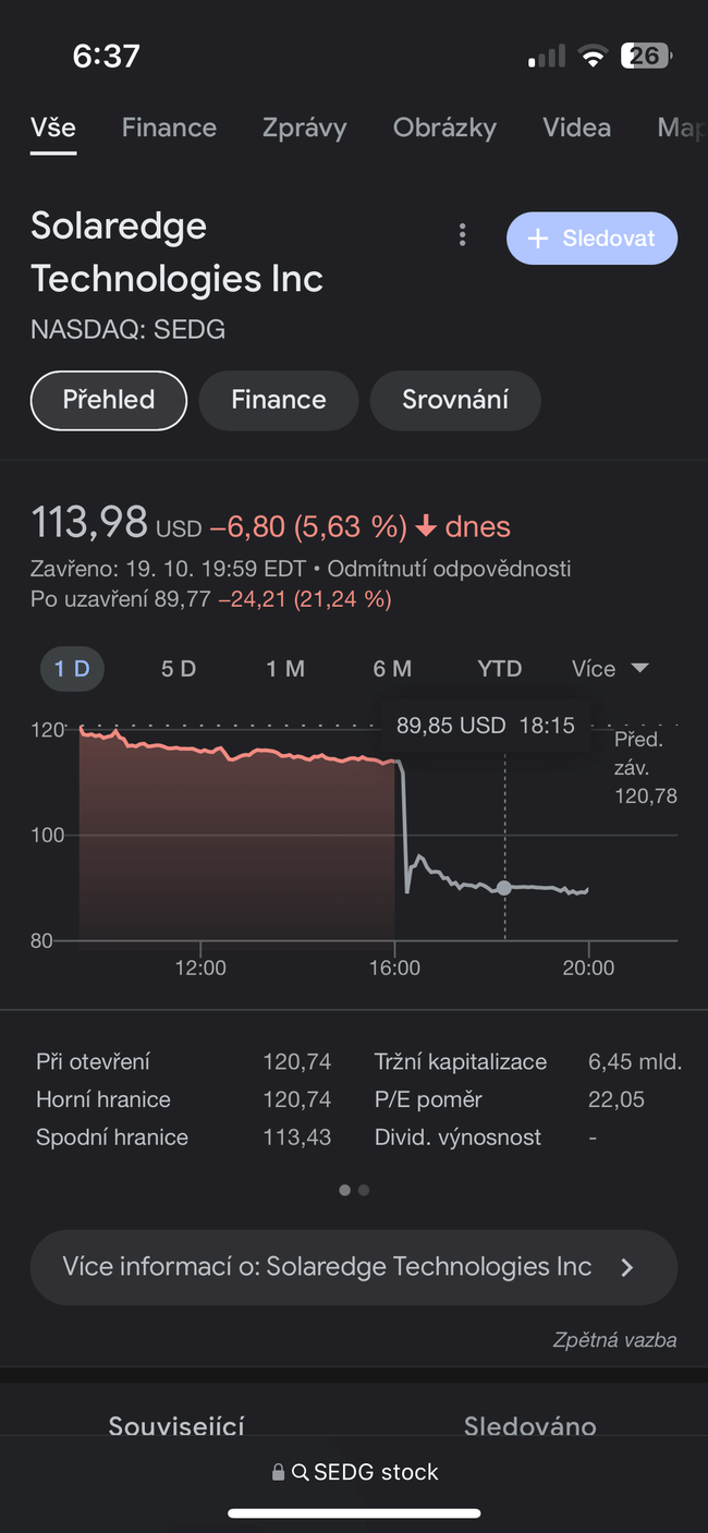 Včera po uzavření trhu přišli obrovské propady u dvou, (možná i dalších, ale ty nesleduji), velkých společnosti jako $ENPH a $SEDG.