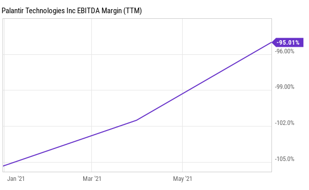 Pro měření kvality nerentabilních společností, jako je Palantir, můžeme použít pravidlo 40 (Rule of 40). Protože současná míra růstu společnosti Palantir je 49 %, mohla by mít -9% provozní marži a přesto by prošla pravidlem 40 (růst + marže by měly být vyšší než 40). Současná provozní marže společnosti Palantir je však -95 % 😅. To dává společnosti Palantir propastné skóre -46 😲.