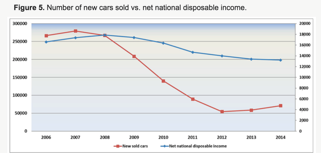 Přestože disponibilní příjem je stále na lineární trajektorii a bude stále výhodný pro utrácení za levnější produkty, spotřeba produktů, které vyžadují financování, jako jsou vozidla, pravděpodobně zaznamená menší poptávku. Níže je uvedena historická korelační studie poptávky po vozidlech a disponibilním příjmu, všimněte si také citlivosti nově prodaných vozidel v USA v závislosti na disponibilním příjmu.